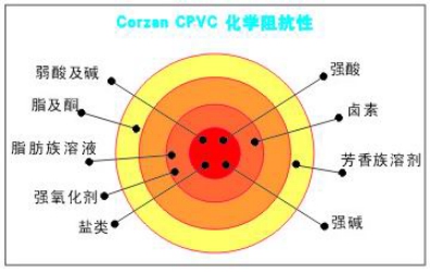 CPVC由于含有高量安定化合的氯原子,因此拥有非常好的化学耐蚀性,整体耐蚀能力介于PVC与PVDF之间,对大部分的无机酸、碱、盐和高分子量脂肪烃碳氢化合物呈惰性反应, 并且对强氧化物及卤素有良好的阻抗力。