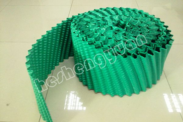 圆形逆流式冷却塔填料又称“斜交错冷却塔填料”由改性PVC(聚氯乙烯)平片经热压加工而成,淋水填料的作用是将需要冷却的热水溅散成水滴并成型水膜,以增加水和空气的接触面积和接触时间,即增加水和空气的热交换强度。水的冷却过程,主要在淋水填料中进行,在淋水填料中水和空气发生热交换与质交换。冷却塔的冷却效果很大程度上取决于淋水填料的热交换性能。性能良好的淋水填料具有较高的散热能力,斜交错填料具有技术先进、设计合理、数据可靠和经久耐用,经过试验和长时间的生产运行表明冷却效果非常好,通风阻力小,亲水性强,接触面积大等优点。倾斜角度一般为60度,主要用于圆形逆流式冷却塔。